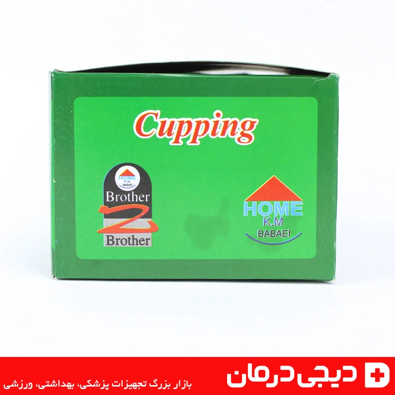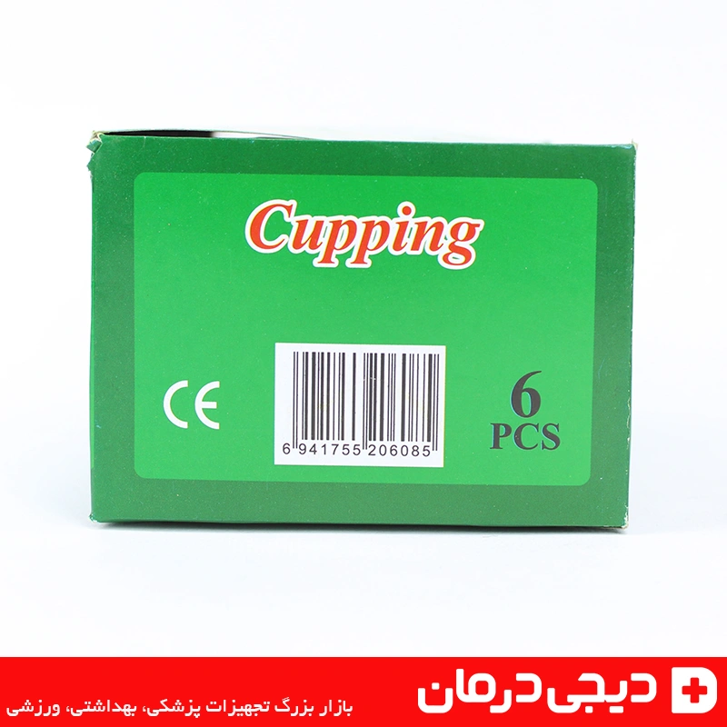 نمای کناری جعبه سبز رنگ بادکش بدن 6 لیوان CUPPING که تعداد 6 PCS روی آن درج شده است و نشان دهنده وجود شش لیوان در بسته برای بادکش دستی و حجامت خشک می باشد .