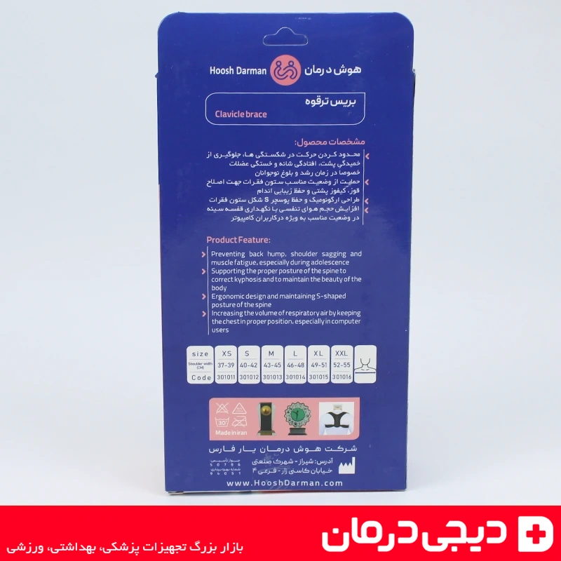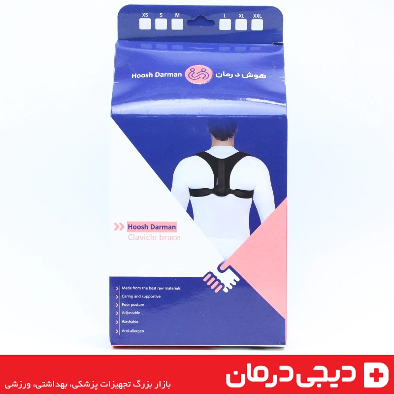 بریس ترقوه طبی برند هوش درمان Hoosh Darman با طراحی ارگونومیک و ساختار تخصصی، برای جلوگیری از خمیدگی پشت، اصلاح افتادگی شانهها، درمان شکستگی ترقوه و اصلاح وضعیت بدنی در نوجوانان و بزرگسالان تولید شده است.