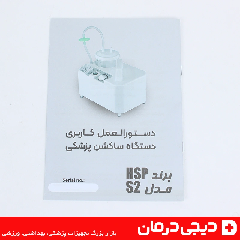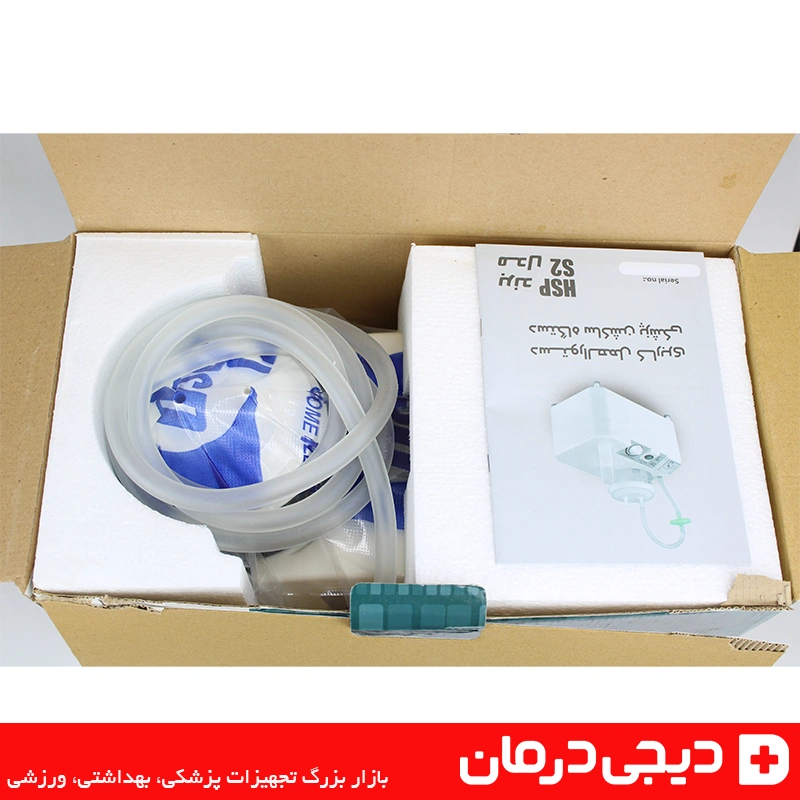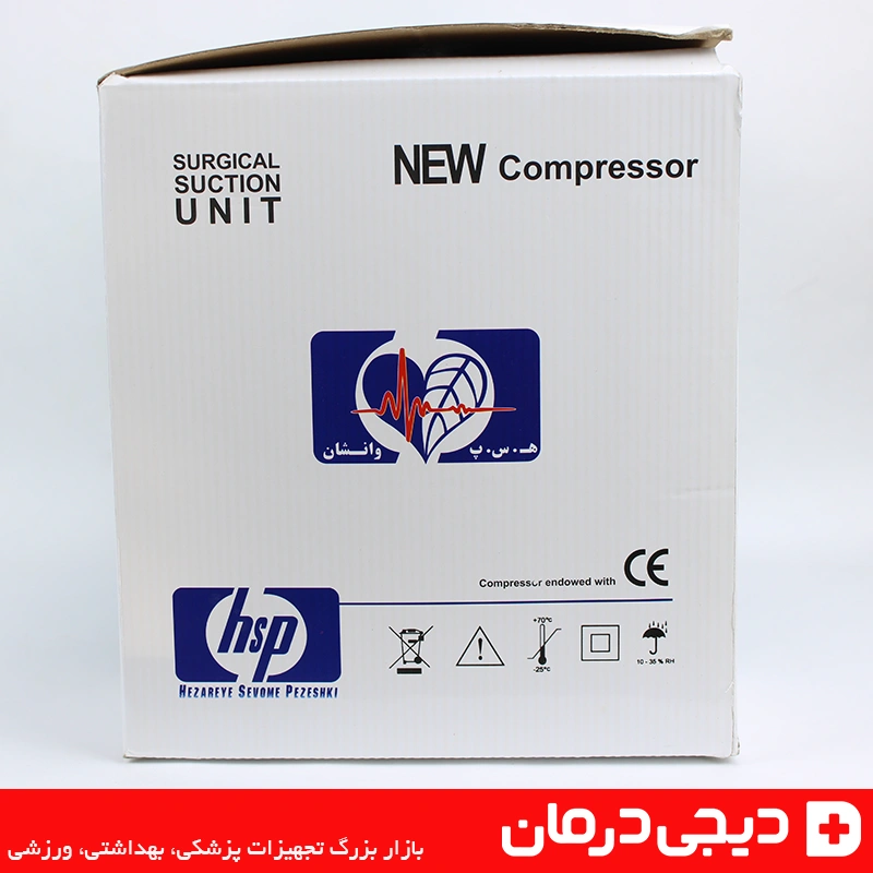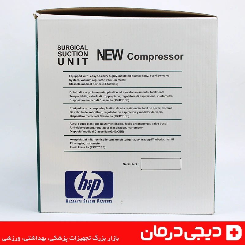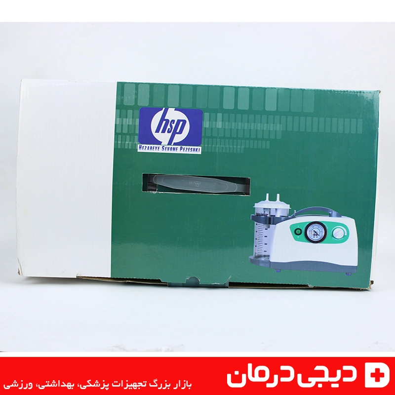 بسته بندی رسمی دستگاه ساکشن اچ اس پی با لوگوی hsp و توضیحات محصول مخصوص مراکز درمانی و خانگی.