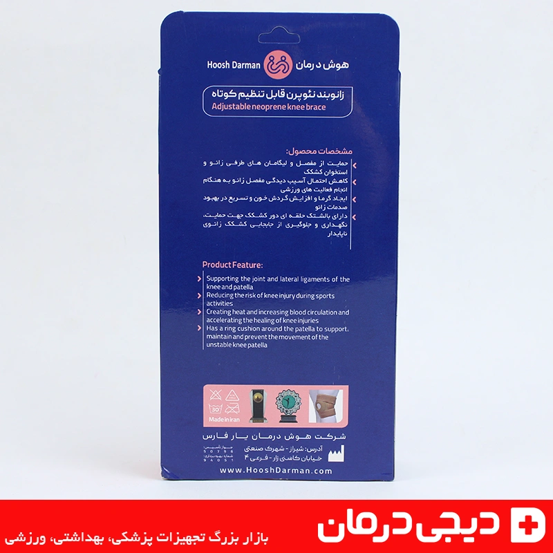 این محصول که با نام های زانوبند طبی نئوپرن، زانوبند قابل تنظیم، زانوبند کوتاه هوش درمان و زانوبند طبی Hoosh Darman نیز شناخته می شود، توسط برند معتبر هوش درمان تولید شده است.