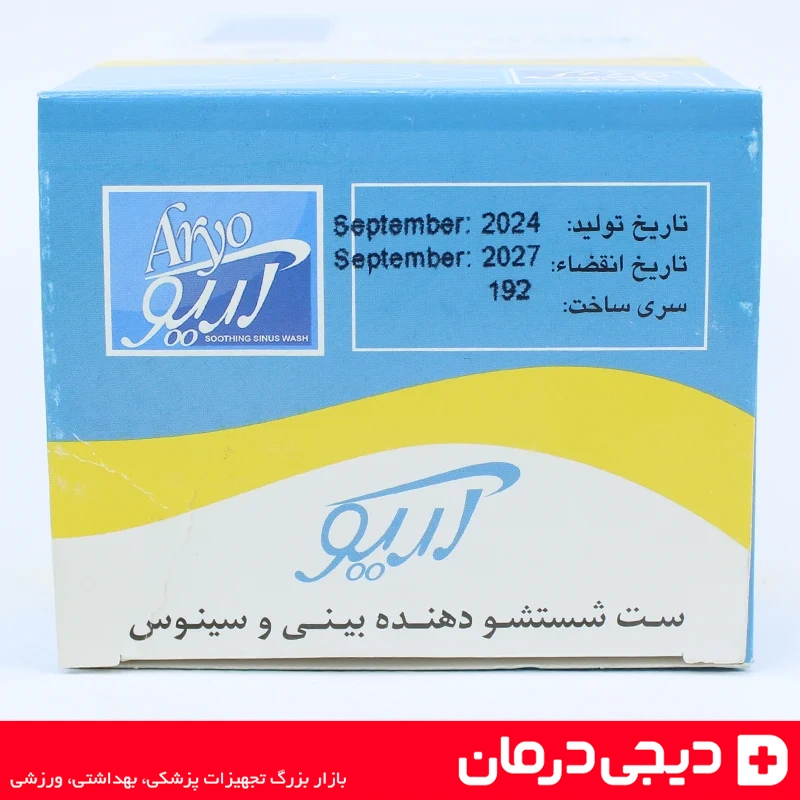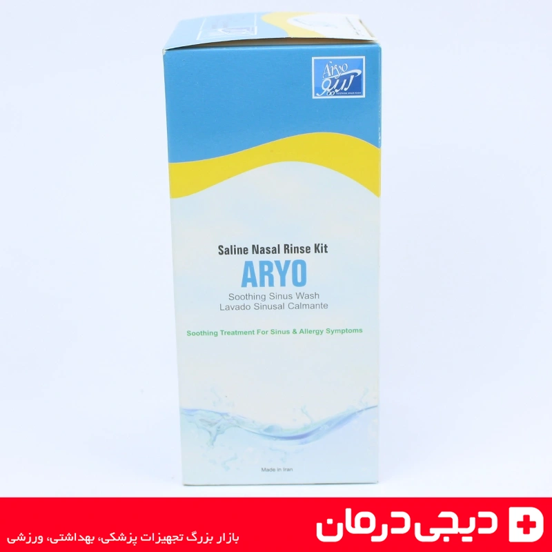 نمای بستهبندی خارجی سینوس شور آریو مدل ARYO برای شستشوی بینی و سینوس، کمک به رفع گرفتگی و بهبود تنفس، موجود در فروشگاه دیجی درمان.