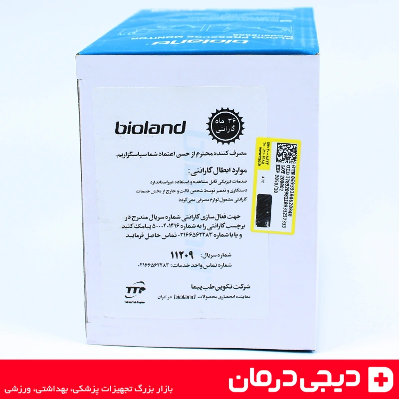 نمای جعبه فشارسنج دیجیتال بیولند مدل 2008 همراه با برچسب گارانتی معتبر و اطلاعات خدمات پس از فروش.