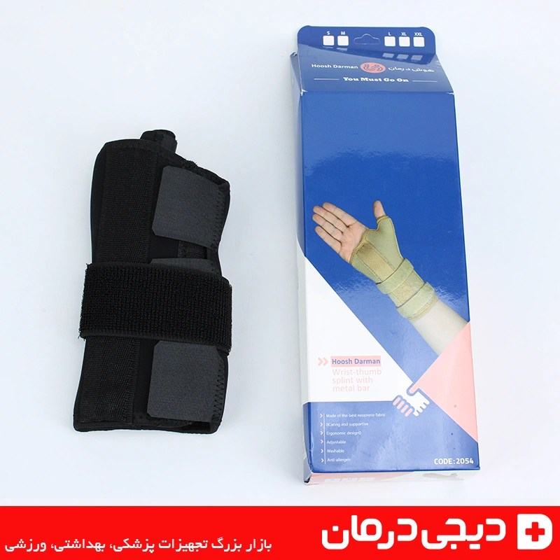 مچ بند آتل دار هوش درمان با پارچه ضد حساسیت و آتل فلزی برای تثبیت مچ و انگشت شست طراحی شده است .