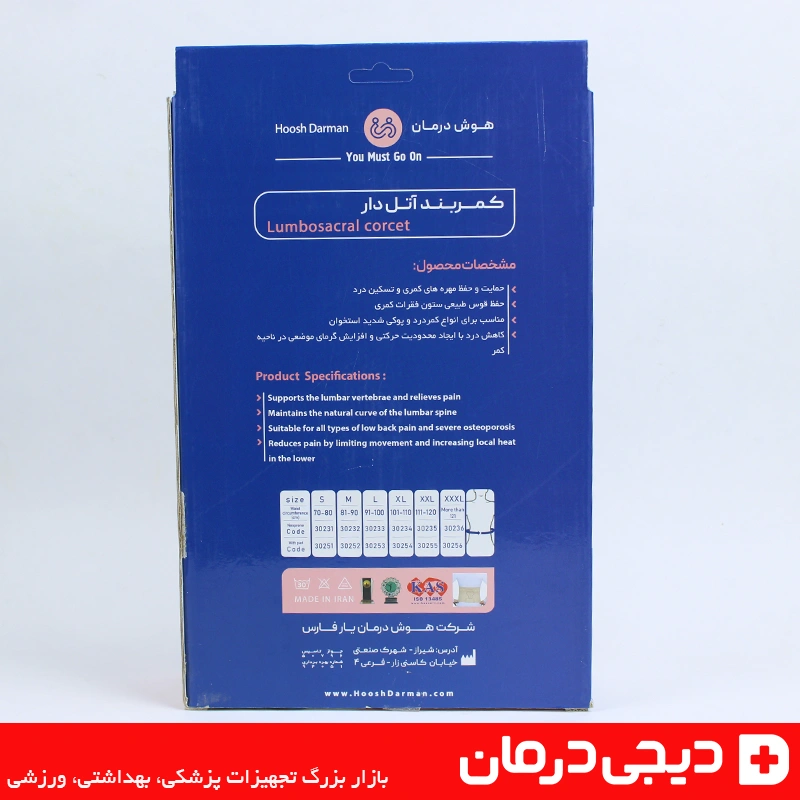 کمربند طبی آتل دار با طراحی ویژه خود توسط برند معتبر هوش درمان Hoosh Darman ساخته شده و مدل Lumbosacral Corset آن مخصوص افرادی است که دچار کمر درد مزمن ، دیسک کمر ، آرتروز ستون فقرات ، یا پوکی استخوان هستند .